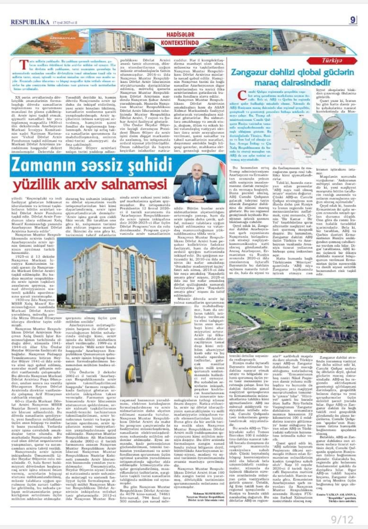 Naxçıvan Muxtar Respublikası Dövlət Arxiv İdarəsinin rəisi Mehman Məmmədovun "Zamanın səssiz şahidi yüzillik arxiv salnaməsi" adlı məqaləsi mətbuatda dərc edilib.